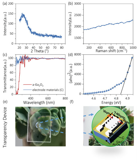(a) XRD diffraction pattern and (b) Raman spectra of gallium oxide films; (c) transmission spectra of the gallium oxide film and electrode materials; (d) optical bandgap of gallium oxide film form Tuac formula; (e) the original photograph of the fully transparent device; (f) the graphic views of the device.