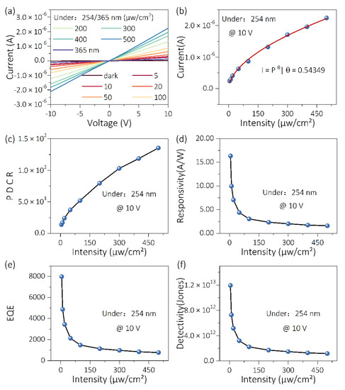 Figure 2a shows the I-V characteristic curve of the device under 254 nm illumination, 365 nm illumination, and dark state. An observation can be made that the photocurrent of the device and voltage manifest an evident linear relationship indicating the carbon electrodes and a-Ga2O3 thin film have good ohmic contact [23]. The dark current of the photodetector is around 1.64 × 10−8 A at 10 V bias voltage. Meanwhile, the photocurrent of the device increases with an increase in light intensity because high light density promotes the generation of electron-hole pairs. To better understand the above relationship, the curve of photocurrent with light intensity under 10 V bias voltage is displayed, as shown in Figure 2b. In general, the dependence of photocurrent on light intensity can be fitted by the power function: I = Pθ, where I is photocurrent, P is light intensity, and θ is the photocarrier activity. The value of θ obtained by fitting is about 0.54, which deviates greatly from the ideal value (θ = 1). The results demonstrated that the a-Ga2O3 thin film has many defects, which affect the carrier transport and increase the carrier energy loss [24]. The device’s performance under different illumination was calculated to quantitatively evaluate the performance of a-Ga2O3 thin film-based solar-blind ultraviolet photodetectors. The photo-to-dark current ratio (PDCR) is an important parameter to measure device performance and is defined as [25]: