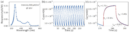 To further understand the photoelectric characteristics of a solar-blind UV detector constructed with a C electrode, the spectral response of the device at 10 V bias voltage is shown in Figure 3a. It can be seen that the responsivity of the device begins to increase from the visible band to the solar-blind band and the maximum value is at the wavelength of 275 nm. The responsivity decreases sharply with the increase in optical wavelength, and the rejection ratio (R254/ R365) can reach 21.82. The device illustrates that it has a high sensitivity to solar-blind ultraviolet light, favorable solar-blind characteristics, and spectral selectivity with the result. Important quality requirements for solar-blind ultraviolet photodetectors are repeatability and stability. To test the stability of the device, the ultraviolet light source of 254 nm is controlled with a switching period of 10 s at 10 V bias voltage, and the working state of the device is collected at a light intensity of 500 μw/cm2, and the transient light response curve as shown in Figure 3b is drawn. There is no obvious difference in the magnitude of photocurrent after 14 switching cycles indicating the device has good stability and high repeatability. It is well known that the light response time can be divided into rising and decaying processes, and the quantitative analysis of the time can be fitted with the following types of exponential relaxation equations, with the functional formula as follows [30]: