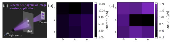 Finally, the potential application of the device array in deep ultraviolet imaging is explored, and the principle is shown in Figure 4a. The “C” character is placed between the 254 nm lamp and the photodetector array. Ultraviolet light shines on the device through the mask, and the rest remains in the dark or weak ultraviolet light. Whereafter the current of each equipment unit is recorded unit by unit by connecting a pair of probes of the semiconductor parameter analyzer. The uniformity of the photodetector array is one of the most important requirements in imaging applications. Before the verification of imaging ability, the uniformity of the photodetector array is tested; meanwhile, record the dark current of each device unit of the device array under dark conditions and combine the results into a three-dimensional current comparison diagram, as shown in Figure 4b. As we can see, the dark current of all device units can be kept at the same level, and the narrow fluctuation indicates that the array has high uniformity possessing the potential for imaging applications. Subsequently, the application verification of solar-blind imaging was carried out. The 2D comparison diagram of the device current is shown in Figure 4c. It is worth noting that the device can display a clear “C” character shape. The above results show that the solar-blind photodetector array has the possibility to be used for solar-blind imaging and machine vision.