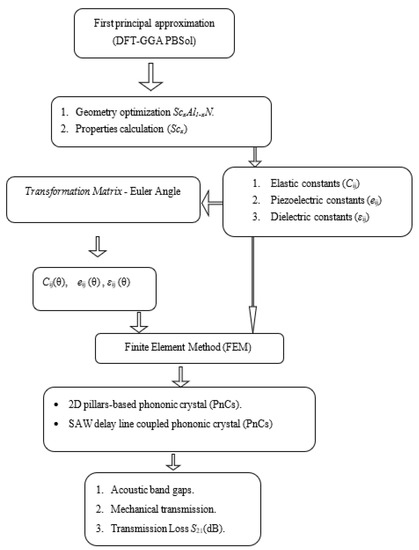 Density Functional Theory (DFT), in combination with generalized gradient approximation GGA-PBE [59], is used to predict the structural characteristics and elastic coefficients of w-ScxAl1-xN Wurtzite crystals. A Monkhorst–Pack mesh of 5 × 5 × 5 k-points in the Brillouin-zone integral was used with a cutoff energy of 500 eV and total energy convergence threshold of 10−6 eV [60]. The Density Functional Theory Perturbation (DFTP) [61] was used to determine both piezoelectric and dielectric constants of w-ScxAl1-xN in the range of x = 0, 0.125, 0.25, and 0.375, and then, the elastic constants (Cij), the piezoelectric coefficients (eij), and the permittivity tensor (εij) of w-ScxAl1-xN. The physical parameters were introduced in the Finite Element model (COMSOL) to obtain the acoustic band gaps of the 2D ScxAl1-xN pillar-based phononic crystals (PnCs), the mechanical transmission, and the transmission loss S21(dB) of the SAW delay line. The results were compared with the non-structured surface. The same methodology was used in the case of the c-axis tilt angle of w-ScxAl1-xN [62] (see diagram in Figure 1).
