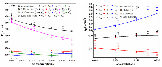 The dependence of the piezoelectric coefficients e15, e31, and e33 with increasing Sc content is consistent and follows the general trend obtained from previous theoretical results [64,65,67,68] and experimental measurements [9,69,70].