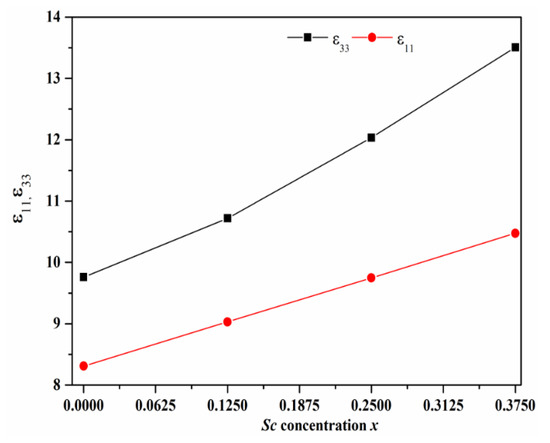 Table 2 shows that our calculated dielectric constants ε11 and ε33 at x = 0% are in good agreement with previous data [68,69,70]. Then, as seen in Figure 3, the two components ε33 and ε11 increase almost linearly with the concentration of Sc [21]. Obviously, ε33 is more sensitive than ε11, increasing by 38% compared to 26%. This is mainly due to the strong lattice polarization induced by the out-of-plane (c-axis) Sc atom.