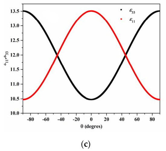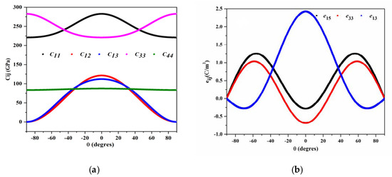 According to Euler’s laws on the rotation, all physical matrices in a new orientation are obtained by a transformation matrices methodology [77]. Figure 4a illustrates the dependence of Cij against the inclination angle θ. It is clearly seen that, when changing θ from −90° to 90°, a symmetric behavior for all Cij is observed at θ = 0°. The increase in θ leads to decreases in C11, C12, and C13. An opposite dependence is observed between C33 and C11 due to the c-axis inclination angle, as these two elements are related to the out-of-plane and in-plane component. It should be mentioned that C44 does not depend on the inclination angle, which can be explained by the fact that x2 and x2′ present the same axis.