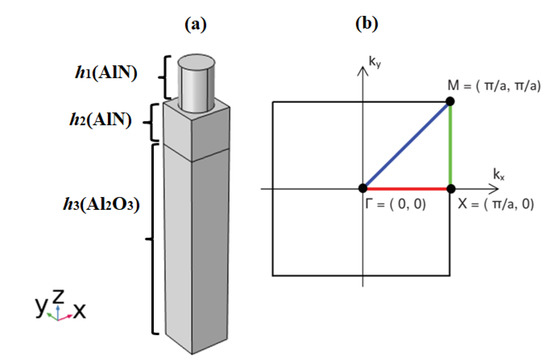 In this study, we define a phononic crystal (PnC) made of AlN cylindrical pillars, deposited on a semi-infinite AlN/Al2O3 substrate, arranged in a square lattice. The elementary unit cell, shown in Figure 5a, is repeated periodically in the (x, y) plane with the pillar axis oriented along the z-axis. The filling factor is defined by f = π.r2/a2, where a is the lattice parameter of the phononic crystal and r the radius of the cylindrical pillar. The pillar height is h1, h2 is the thickness of the AlN layer, and h3 is the thickness of the bulk material (Al2O3), chosen to be five times the lattice constant of the PnCs unit cell (h3 = 5 × a) [81].