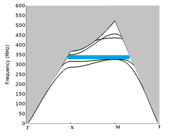 Figure 6 depicts the computed acoustic band structure in the first irreducible Brillouin zone, along the high symmetry directions, for pillars with a relative height h/a, and radius r/a of 30% and 37.5% respectively. The sound line delimits the bulk modes (gray area) from the surface coupled modes, below the line. The latter correspond to SAW modes with an acoustic energy localized at the surface and/or in the pillars. Under those conditions, the blue area represents an acoustic bandgap, extending from 313 to 350 MHz, with an 11% relative bandwidth, generated by local resonances of pillars interacting with the SAW [58].