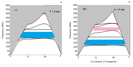 where fu and fl represent respectively the upper and lower frequency limits of the band gap. The band gaps operating parameters have been investigated as a function of the geometrical parameters, namely the pillar’s height (h) and radius (r). Figure 7a–c show the phononic crystal band structure for three different characteristic values of (h), i.e., 4, 6, and 8 µm, with a fixed radius value of r = 3 µm and a = 8 µm. The dependence of the forbidden band according to the height of the pillars is highlighted. The absolute band gap of the SAWs is limited to the domain below the sound line. When h = 4 µm, only one absolute band gap is observed (Figure 7a), whereas two band gaps occur for 6 µm, then three for 8 µm. Additionally, when the height of the pillars h increases, the band gaps downshift toward low frequencies and new band gaps appear. According to [58,83], they can be attributed to local resonance bandgaps.