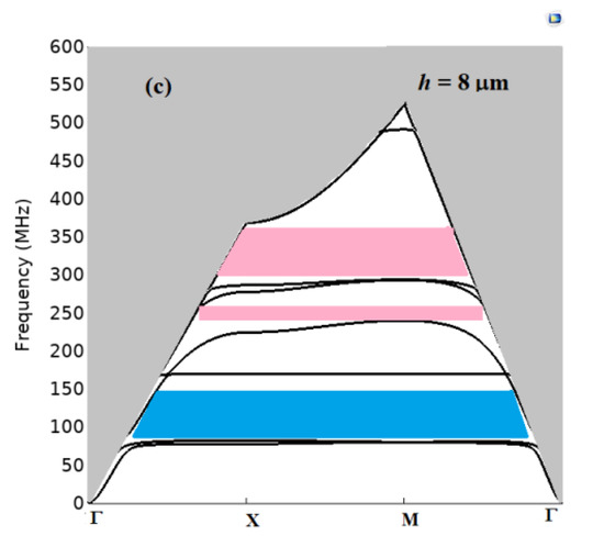 PnC band structures of lattice parameter a = 8 µm for AlN pillars of radius r = 3 µm and different values of h: (a) h = 4 µm, (b) h = 6 µm and (c) h = 8 µm.
