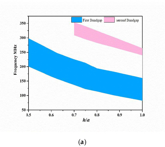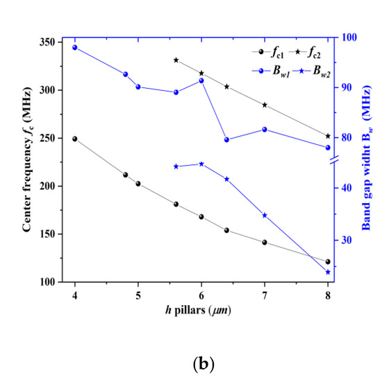 Figure 8a outlines the evolution of the first and second acoustic band gaps with the aspect ratio h/a in the range [0.3, 1]. We find that the height of the pillars plays an important effect on both the width and the frequency position of the gaps. Increasing h shifts the band gaps down toward low frequencies. By comparison, the second acoustic bandgap does not exist until h/a = 0.7. For h/a = 0.7, the first and second acoustic bandgaps now extend from 136 to 225 MHz and from 309 to 352 MHz, respectively. Figure 8b shows, as an example, the variation in fc and Bw of the first and second bandgap as a function of h, keeping constant a = 8 µm and r = 2.6 µm. For the first (resp. second) band gap, the width Bw decreases from 98 MHz (resp. 45 MHz) to 78 MHz (resp. 24 MHz) when h increases from 4 µm (resp. 6µm) to h = 8 µm. Furthermore, as shown in Figure 8b, the center frequency fc1 decreases almost linearly from 339 to 121 MHz when h changes from 2.4 to 8 µm, and fc2 decreases from 331 to 252 MHz when h changes from 5.6 to 8 µm.