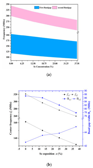 As mentioned in Section 1, the elastic, dielectric, and piezoelectric coefficients of AlN are affected by the doping concentration in Sc which, in consequence, has the potential to affect the acoustic bandgap characteristics, i.e., the frequency position fc and the bandwidth Bw. Indeed, as seen Figure 9a, when the Sc concentration increases, both first and second band gaps exhibit a consequent shift down toward low frequencies, while their widths are slightly modified. This is confirmed by a representation of fc and Bw as a function of the Sc concentration (Figure 9b). From this figure, we notice that the center frequencies vary linearly from 161 to 131 MHz and from 321 to 259 MHz when the Sc concentration increases from 0 to 37.5% for the first and second acoustic band gaps, respectively. Such a variation is due to the acoustic velocity which is modified by the elastic constant Cij and density ρ (g/cm3) of w-ScxAl1-xN. For the two band gaps, the bandgap width (Bw) has been slightly modified, with a variation of −10% for the first gap and +7% for the second.