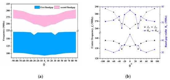 Finally, we studied the dependence of the acoustic bandgaps on a tilted c-axis orientation angle of a w-Sc0.375Al0.625N PnC-based structure. From the results shown in Figure 10a,b, it is clear that when θ changes from −90° to 90°, a symmetric behavior with respect to θ = 0° is observed for the two acoustic bandgaps, due to the dependence of Cij on the angle of inclination. Additionally, we can see that the second gap is more sensitive to c-axis inclination angle (see Figure 10b). All the modification of the physical parameters can provide a new perspective for controlling SAW-coupled PnC devices and applications.