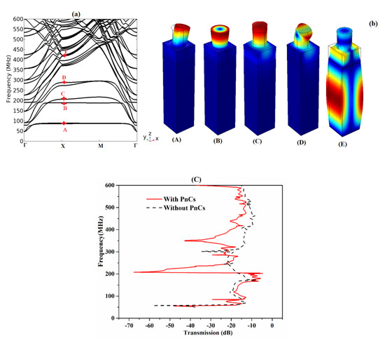 (a) Acoustic band structures of PnC w-Sc0.375Al0.625N pillars on half infinite substrate. (b) Transmission through a finite PnC constituted of an 11-unit cell, with h = 6 µm, r = 2.6 µm, and a = 8 µm (red solid line) compared to the SAW through a non-structured surface (dashed lines). (c) Map of the mechanical displacement fields of modes (A, B, C, D, and E).