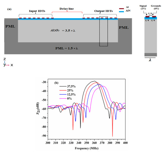 We first generated a SAW of wavelength equal to 16 µm through the ScxAl1-xN piezoelectric layer of 2 µm thickness in the x direction. Figure 12b shows the insertion loss (S21) for different values of Sc concentration, i.e., x = 0, 12.5, 25, and 37.5%. As seen in Figure 12b, we were able to generate an acoustic surface pulse in the frequency range (355 MHz, 385 MHz) for pure AlN (x = 0%). When now increasing the Sc concentration, the maximum of the transmitted amplitude increases and shifts toward the low frequencies, from 371 MHz (x = 0%) to 360 MHz (x = 37.5%). Under the same conditions of excitation and for pure AlN (x = 0%), the deviation in the center frequency of the SAW device from the experimental value of 355 MHz obtained by Ginlinger et al. [27] is 4.5%. Moreover, their experimental work shows that doping the AlN (27% Sc) enhanced the performance of ScxAl1-xN-based SAW devices.