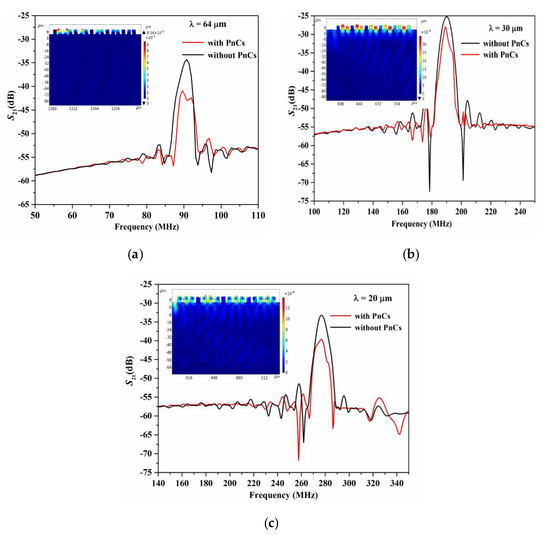 Insertion loss (S21) with (red solid lines) and without (black solid lines) PnCs for different SAW device wavelengths, (a) λ = 64 µm, (b) λ = 30 µm, and (c) λ = 20 µm closed to the eigenmodes A, C, and D.