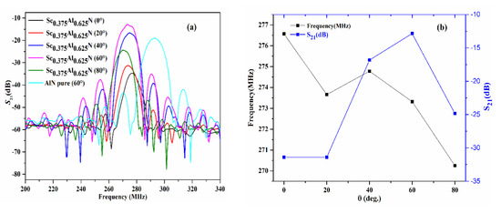 Figure 14b shows that the minimum value of insertion loss is found at the tilting angle θ = 60°. This is due to the coupling factor, whose value is maximum at this angle, which also in good concordance with experimental data [33]. This maximum coupling factor is due to the large piezoelectric constant e15 and e31 of Sc0.375Al0.625N thin films (see Figure 4b). In addition, the variation om the resonances frequencies as a function of x behaves as the calculated SAW velocities at λ= 20 µm (5531.4, 5473.2, 5495.6, 5466.4, and 5405 m/s).