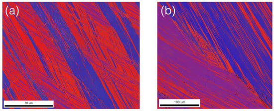 EBSD maps of magnified regions 2 (a) and 3 (b) from Figure 2 displayed in the Euler coding.