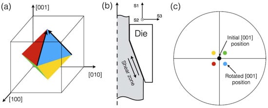 The major differences between tensile and drawing tests are the constraints imposed by the tooling. In particular, material flowing through a cone-shaped die is subjected to an additional shear component (Figure 5b), the magnitude of which changes monotonically along the wire radius with the highest value at the sample surface []. The resulting additional shear component is responsible for the local rotation of the lattice, leading to crystal fragmentation into four quadrants. A geometrical representation of the local crystal rotation is shown in Figure 5a. Among the possible slip planes, for the quadrant presented in Figure 2a, the most favourable slip plane is highlighted in blue. Shearing material along slip directions marked with the black arrows will cause relative lattice rotation around direction [10]. Once again, the described situation can be referenced to the tensile test experiment where, due to external constraints, the tensile axis rotates in the opposite direction to the shear in an active slip system [,]. Complete split and rotation of the (200) pole in all quadrants is presented in Figure 5c where each pole colour corresponds to the slip plane from Figure 5a. Pole figures presented in Figure 1 clearly support the above analysis. Obtained texture for the sample drawn to 0.29 true strain shows four distinctive poles in the centre of the (200) pole figure, each being the result of the lattice rotation toward the respective <112> direction. While cumulative deformation increases, lattice rotation and thus pole rotation away from the initial <001> position also increase.