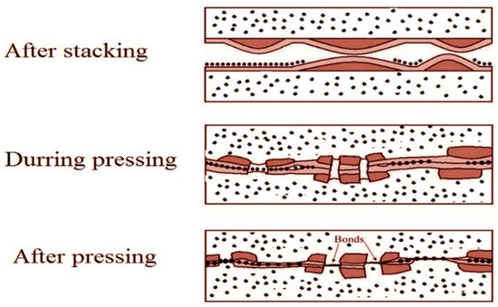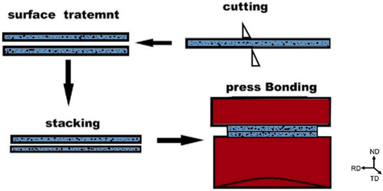 First of all, the casted samples with 100 mm length, 50 mm width and 2 mm height, were machined. Then, the samples were fully annealed at 450 °C for 2 h before the APB process. Moreover, the samples were degreased in the acetone bath for 15 min. In direction to eliminate the surface oxide layer, the surfaces of samples were fully brushed to guarantee a successful bonding. Always Adsorbed ions, greases, oxides and dust subdivisions surrounded the surfaces of the samples. The sample bars were scratch brushed after degreasing in the acetone bath using a rotary speed of 2000 rpm and 95 mm diameter stainless steel with 0.26 mm wire diameter. Therefore, surface cleaning before each cumulative pressing is essential to generate an acceptable bonding. Then, two bars were stacked together to achieve 10 mm thickness and were then press bonded with 50% reduction (plastic strain = 0.8) at 300 °C without any lubrication to achieve 5 mm thickness, Figure 2.