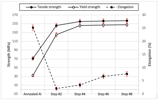 Figure 4 displays the tensile strength values of composite samples versus dissimilar APB steps. The strength of the annealed Al is 81 MPa, and for the sample fabricated with two steps of APB, it is equal to 146 MPa which is a rapidly increasing rate. Afterwards, according to Figure 4, the tensile strength remains approximately constant by cumulating the number of steps up to eight (157 MPa). This trend is also similar for the yield strength. Two mechanisms can clarify this behavior: (I) strain hardening (dislocation strengthening) at a low number of steps, and (II) grain boundary strengthening mechanism by growing the steps due to the creation of the UFG structure inside the metallic matrix [3,13]. In the second stage, a limited strain hardening around the titanium carbide particles is a main objective for growing the strength hardening [3]. TiC particles can initiate slip systems in the aluminum matrix close by combing its layers, in which their density and the amount of local strain hardening in them expands by cumulating the plastic strain up to the 8th step.