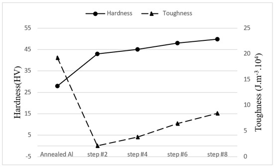 The tensile toughness and average Vickers micro-hardness of composite samples versus various APB steps are displayed in Figure 6. According to Figure 6, the average micro hardness has an increasing rate from the annealed Al up to step #4 and then remains approximately constant with a minor additional change up to step #8. The initial increasing stage of the average Vickers micro hardness is linked to the strain hardening and cumulating the dislocations density inside the crystalline lattice [3]. By increasing the number of steps up to eight, the hardness is saturated [14]. Dislocations saturation occurs at larger plastic strains [3,14]. The locking mechanism of dislocations always happens at higher plastic strains, which generates an unvarying spreading of particles through the alloy matrix [3].