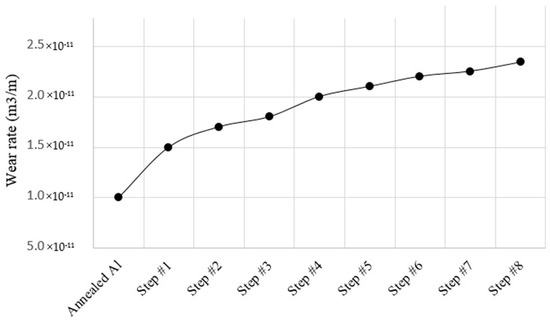 Figure 7 shows the weight loss of composite samples produced with one and eight APB steps after the wear test. According to Figure 7, the weight loss of the composite with one step is more than the sample fabricated after eight steps. In other words, debris particles formed at the initial steps increase the mass loss rate at higher APB steps. Additionally, uniform distribution of TiC particles leads to the improvement of wear resistance. The wear resistance of all APB samples increases in comparison with the annealed Al. From steps 1–4, the wear curve rapidly increases. This trend is due to the work-hardening effect of the Al matrix and the dislocation strengthening around TiC particles. In addition, from step #4 up to step #8, there is a smooth increasing rate due to the saturation of dislocation strengthening through the Al matrix. Furthermore, the wear resistance improves by generating a harder situation for cracks propagation due to decreasing the porosities between Al and TiC particles which improves the bonding between them. The wear resistance increases rapidly for the sample produced after a cold pressing with 50% of the reduction thickness after 8 steps. Although all prior accumulative pressing processes were completed at 300 °C, this behavior is due to the severe strain-hardening effects during the applied cold pressing process.