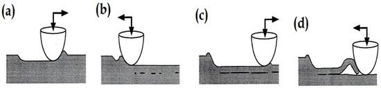 Schematic illustration of the delamination during the wear test at the (a) starting, (b,c) middle and (d) reciprocating wear round.