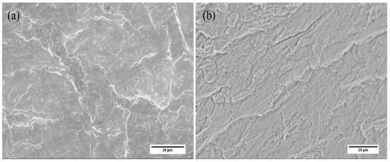 SEM microphotographs of worn surface of composite samples after (a) Step #1 and (b) Step #8.