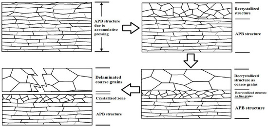 Drawings of the sliding wear of APB composite samples vs. different steps of deformation and recrystallization mechanism.