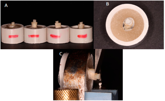 Shear bond strength (SBS) assembly. (A,B) Bonded resin-adhesive-dentin samples.(C) Assembly of the customized metal probe with mounted bonded samples for SBS in universal testing machine.