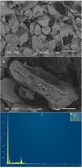 On SEM micrographs, the filler CNPs demonstrated cylindrical and roughly hexagonal shapes (Figure 1A,B). This finding matches several previously published studies that have confirmed the cylindrical/hexagonal shape of the nanoparticles form [24,25]. Nevertheless, this cylindrical or hexagonal shape could be attributed to the hexagonal organization of the carbon atoms as these atoms are entirely sp2-hybridized while being organized in a hexagonal lattice [11]. The EDX mapping of the CNPs showed the presence of C as the primary element in the CNPs (Figure 1C). This conforms to previously published literature where C was also found to be the principal element of CNPs upon EDX analysis [26,27].