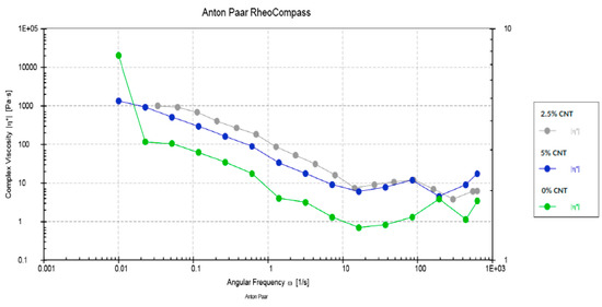 Rheological properties of control adhesive (CA-0% CNP), 2.5% CNP and 5% CNP. Complex viscosities with angular frequency at 0.001 to 1000 rads/s can be observed.