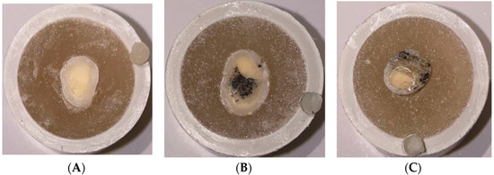 Shear bond strength samples among groups after failure. (A) 0% CNP; (B) 2.5 wt.% CNP; (C) 5 wt.% CNP.