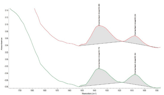 For all the adhesive groups, representative FTIR spectra were recorded. The DC was calculated by approximating the disparities in the peak height ratio of the absorbance intensities of the aliphatic C=C peak at 1638 cm−1 and that of a standard inner peak of aromatic C=C at 1608 cm−1 during polymerization, as opposed to the uncured adhesive. The highest DC was shown by the 0% CNPs (CA) (68.24 ± 4.88) followed by 2.5% CNP group (42.91 ± 5.43), while the 5% CNP (Figure 6) group demonstrated the lowest DC values (34.32 ± 4.60) (Table 2). Statistically significant results (p < 0.01) were detected when the DC values of the CA group were matched with the other two groups and when both CNP adhesive groups were compared with each other (Table 2).