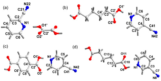 The molecular structures of compounds 1–4 have been depicted in Figure 1a–d, respectively. (ox)0.5(2-CNpy) (1) crystallizes in a monoclinic crystal system with a P21/c space group. The asymmetric unit of 1 contains one molecule of 2-CNpy and 0.5 molecules of ox moiety (Figure 1a). Crystal-structure analysis reveals the presence of center of inversion in 1 located at the mid-point of the C-C bond of ox moiety. (adp)(4-CNpy)2 (2), (tp)(4-CNpy)2 (3) and (adp)(3-CNpy)2 (4) crystallize in a triclinic crystal system with a P space group. The asymmetric units of 2 and 3 contain two molecules of 4-CNpy and one molecule of adp and tp, respectively (Figure 1b,c). Co-crystal 4 contains one adp moiety and two 3-CNpy moieties (Figure 1d) in the asymmetric unit. Further analysis reveals the presence of a crystallographic center of the inversions in 2, 3 and 4, located at the mid-points of the C-C bonds in adp and at the centroid of the aromatic ring of tp, respectively.