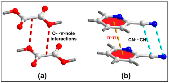 Crystal structure analysis of co-crystal 1 reveals the formation of two different supramolecular dimers involving the ox and 4-CNpy moieties (Figure 2). The neighboring ox moieties of 1 are interconnected via unconventional O···π-hole interactions [82,83] to form a supramolecular dimer (Figure 2a). The O1´ atom of an ox is involved in unconventional O···π-hole interactions with the π-electrons of the C-C bond of a neighboring ox, having a O1´···Cg distance of 3.14 Å. Such O···π-hole interactions involving the ox moieties are scarcely reported in the literature. Our research group has recently reported a similar O···π-hole interaction involving the C-C bond of the ox moieties in an oxalato bridged ternary Cu(II) complex, as first reported in [83]. Another interesting supramolecular dimer is also observed in the supramolecular assembly of 1, involving the 4-CNpy moieties (Figure 2b). The neighboring 4-CNpy moieties are involved in unusual parallel nitrile–nitrile [84] and π-stacking interactions. Unconventional parallel nitrile–nitrile interactions are observed between the nitrile moieties of 4-CNpy and the C⋯N distance of 3.66 Å. The C2–C21≡N22 angle is slightly deviated from linearity (179.6°), which may be due to the intermolecular supramolecular interactions involving the nitrile moieties [84]. Furthermore, aromatic π-stacking interaction is also observed in the supramolecular dimer having a centroid(N1, C2–C6)–centroid(N1, C2–C6) separation of 3.66 Å. These interactions have been further studied and characterized theoretically using various computational tools (vide infra).