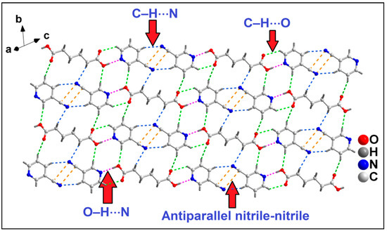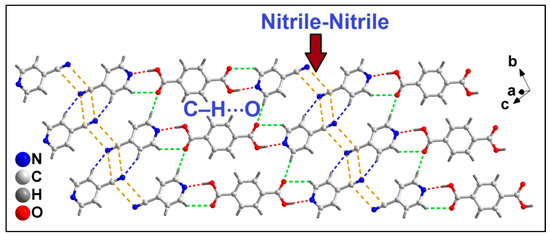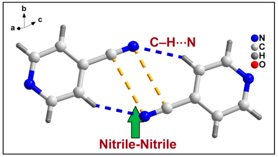 Various noncovalent interactions such as hydrogen bonding, π-stacking, van der Waal’s forces, etc., predominantly trigger the assembly of the multicomponent systems at a fixed stoichiometric ratio in ambient conditions [18,19,20]. Hydrogen bonding interactions are well-known for playing crucial roles in the molecular recognition, composition and stability of the co-crystals [21]. Hydrogen bonding interactions are often employed when designing a synthon, as they have been well-recognized as the most powerful force to organize molecules in the solid state [22]. The functional groups of carboxylic acids, alcohols, amides and heterocyclic bases of co-crystallized conformers are readily involved in strong hydrogen bonding interactions [23,24]. The bioactivities of such compounds as well as the generation of supramolecular layered assemblies are mainly due to the presence of these functional groups [25]. The aromatic π-stacking interactions observed between the aromatic rings of cyclic ligands are imperative in the development of pharmaceutically active flexible materials [26]. π-stacking interactions are important for systems containing aromatic rings, which usually range from large biological systems to relatively small molecules [27,28]. However, recently explored noncovalent interactions, viz. σ- and π-hole contacts, have also significantly contributed to the stabilities of supramolecular architectures [29,30,31]. Noncovalent nitrile–nitrile interactions play a crucial role in the stabilization of the supramolecular assemblies and are, therefore, of particular interest from the crystal-engineering viewpoint [32].