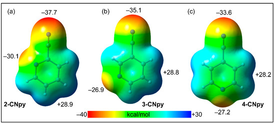 MEP surfaces of compounds 2-CNPy (a), 3-CNPy (b) and 4-CNPy (c) at the PB86-D3/def2-TZVP level of theory. The energies at selected points are given in kcal/mol. Isosurface 0.001 a.u.