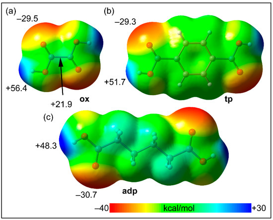 MEP surfaces of dicarboxylic acids; ox (a), tp (b) and adp (c) at the PB86-D3/def2-TZVP level of theory. The energies at selected points are given in kcal/mol. Isosurface 0.001 a.u.