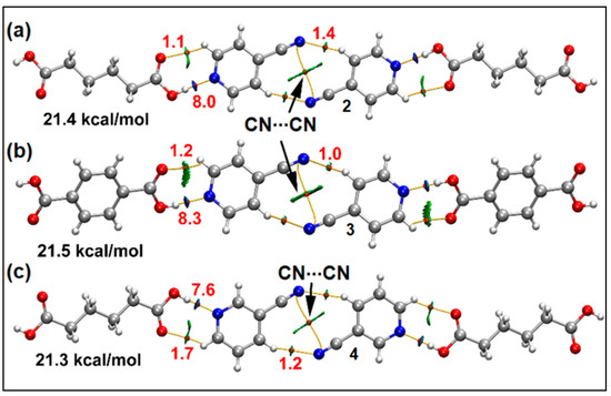 Co-crystals 2–4 present similar assemblies in the solid state, where the cyanopyridine rings form centrosymmetric dimers held together by C–H···N and antiparallel CN···CN interactions. Moreover, these dimers interact with the dicarboxylic acids, forming strong O–H···N and weak C–H···O H-bonds. Those assemblies have been analyzed, and the results gathered in Figure 8, including the QTAIM/NCI plot analyses. It can be observed that the three assemblies have similar dissociation energies (~21 kcal/mol). Such large dissociation energy confirms the relevance of these concurrent motifs in the solid state of the co-crystals. The QTAIM shows that each H-bond is characterized by a bond critical point (CP, represented by a red sphere in Figure 8) and bond path (represented as an orange line) connecting the H to the N-atoms of nitrile or pyridine or the O-atoms of the carboxylic groups. The interactions are also revealed by the NCI plot index, showing blue reduced density gradient (RDG) isosurfaces for the O–H···N H-bonds and green RDG isosurfaces for the C–H···O/N bonds, thus evidencing the strong and weak nature of the H-bonds, respectively. This is further confirmed by the dissociation energies computed for each H-bond contact (values in red in Figure 8, next to the bond CPs).