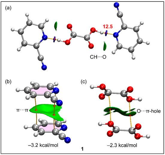 For compound 1, we have analyzed a similar assembly, where ox interacts with two 2-CNPy rings (Figure 9a). In this case, the H-bond dissociation energy is very large (12.5 kcal/mol), in line with the strong acidity of the oxalic acid. The NCI plot analysis disclosed a green RDG isosurface between the O-atom of ox and one aromatic proton of the 2-CNPy ring, thus suggesting a small C–H···O contribution to the formation of this trimeric assembly. We have also analyzed two additional interactions that are also important in the solid state, as described above (see Figure 2). For the π-stacked dimer, the QTAIM shows three bond CPs and bond paths connecting only the pyridine rings. However, the NCI plot analysis shows that the green RDG isosurface embraces the π-systems of both the pyridine and the cyano groups, thus suggesting the participation of the CN groups. In fact, the dimerization energy (–3.2 kcal/mol) is slightly greater in absolute value than that reported for the benzene dimer (–2.7 kcal/mol) [89], thus suggesting that the cyano groups have a favorable influence on the π-stacking.