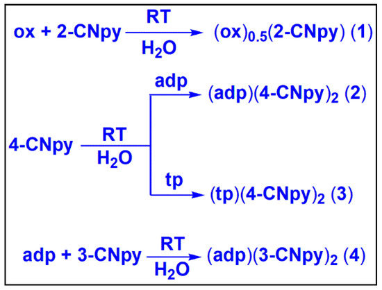 (ox)0.5(2-CNpy) (1) has been synthesized by the reaction between one equivalent of ox and two equivalents of 2-CNpy at room temperature in deionized water medium. Similarly, (adp)(4-CNpy)2 (2) and (tp)(4-CNpy)2 (3) have been synthesized by the reaction between two equivalents of 4-CNpy with one equivalent of adp and tp, respectively. (adp)(3-CNpy)2 (4) has been prepared by reacting one equivalent of adp and two equivalents of 3-CNpy in water medium at room temperature (Scheme 1).