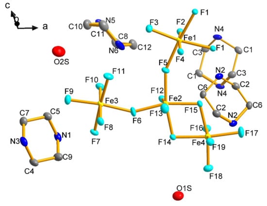 The exploration of hybrid metal halide chemistry has flourished in recent years, due to the potential of such compounds as functional materials, most famously the lead halide perovskites, for example in solar cell applications. The lead halides display a remarkably diverse structural chemistry, incorporating both 3D and layered perovskite-like structures, but also a wider array of lower-dimensional structure types based on layers, chains or isolated polyhedral units [1,2,3]. Metals other than lead have also been incorporated into hybrid systems, with a similarly large and expanding diversity of compositions and structures. Thus, there are many examples of 3d, and even 4d, cations being incorporated into layered hybrid perovskites, for example [4,5,6,7]. Astonishingly, however, work in all these systems has focussed almost exclusively on the heavier halides, Cl, Br or I. Although there are many examples of compounds containing isolated MF6 octahedral units in hybrid fluoride chemistry [8,9], there are only a handful of examples of two-dimensional or higher connectivity of polyhedral units (typically MF6 octahedra) in such systems. An earlier review found only three examples of hybrid transition-metal fluorides with two-dimensional connectivity of linked MF6 octahedra [9]. Specifically these compounds were [H2en]ScF4 (en = 1,2-diaminoethane) [10], [H2pipz]2Mn4F16 (pipz = piperazine) [11] and [Hgua]2Fe5F17 (gua = guanidine); the latter compound appears not to have been published. There are apparently very few more recent examples of layered transition metal fluorides based on linked MF6 octahedra; indeed we can only find two further examples, viz. (NH4)2[Hea]V3F12 (ea = ethylammonium) [12], which has a kagome-like layer and [H2en]MnF4, which has a layered perovskite-like structure [13]. Figure 1 illustrates the inorganic layers in these four previously reported examples. We note further that hybrid fluorides based on linked polyhedra other than MF6 octahedra (i.e., tetrahedra or 7-/8- coordinate polyhedra) are known [9], and also that mixed fluorides with ligands other than F− do exist, for example vanadium oxide-fluorides [14,15] or fluorides incorporating amines as ligands rather than counterions [16]. Transition metal fluorides are likely to be of interest for a variety of physical properties, for example low-dimensional magnetism [12,14] or as cathode materials for Li or Na-ion batteries [17,18].