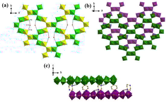 (a) The 2D layers with channel water molecules of 1. The octahedra with different colours show how the “Y” shaped Fe-F building units are connected. (Hydrogen bonds are depicted by dotted lines); (b) Plan view of the layer stacking, with different layers shown in different colours. (H2pipz and water molecules are eliminated for clarity); (c) The stacking of the layers with H2pipz along the b-axis (Selected hydrogen atoms are eliminated for clarity but hydrogen bonds are depicted by dotted lines).