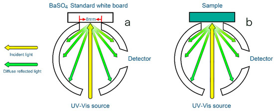 UV-Vis DRS analysis here was equipped with an integrating sphere, and all the reflected radiation emitted by the sample can be diffused and analyzed efficiently by the inner walls of the sphere (Figure 2). Barite (BaSO4, standard white board) (Figure 2a) was first measured, followed by the relative reflectance of the samples (Figure 2b). The beam diameter is ~8 mm. The spectra recorded are in the 220–1000 nm detection range, with 0.5 nm interval and 220 s integration time.