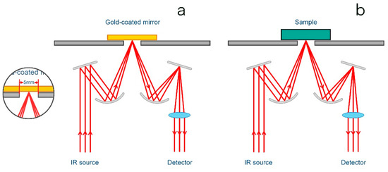 FTIR was performed with the reflection mode. The infrared beam illuminates the sample on the bench, and the detector collects the scattered light to obtain spectra (Figure 3). Background spectra were recorded with a gold-coated mirror with a 5 mm sample cap aperture (Figure 3a), and sample spectra were recorded with the same sample cap (Figure 3b). Both background and sample spectra were obtained in the reflectance mode by 32 scans, with 4 cm−1 resolution over the 400–2000 cm−1 range.