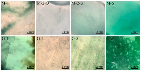 All jadeite jade samples have some similarities in appearance (blue to blue-green, vitreous luster and translucent). The color, structure, and inclusions of each sample are described in Table 1 and illustrated in Figure 4.