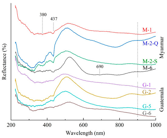 For the blue-green series, the Myanmar sample M-6 and the Guatemalan sample G-6 have some different features in the visible red region, in addition to those in the 380 nm and 437 nm absorption peaks above-mentioned. Sample M-6 has a clear absorption broadband in the visible red region, including a weak peak at 660 nm and a stronger one at 690 nm. These absorption peaks are typically from Cr3+ in octahedral coordination [37,42,43]. Sample G-6 has a wide range of weak absorption in the red zone (600–1000 nm), but no major spectral peaks. Although both samples have a similar appearance (blue-green with a distinct green hue) and contain similar Cr content (XRF data), the Myanmar samples (but not the Guatemalan samples) have distinct Cr3+ absorption spectrum.