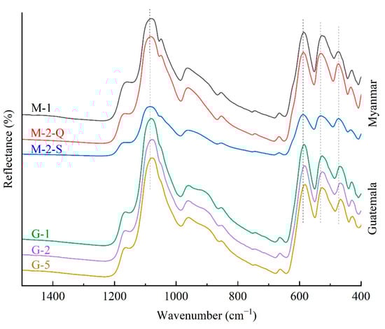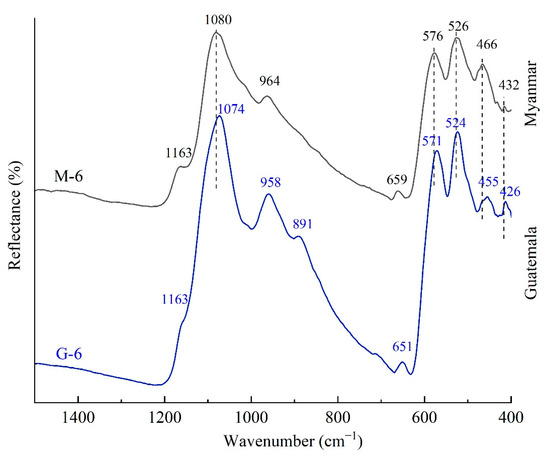 Compared to the blue series jadeite jades, the blue-green series jadeite jades have higher omphacite and iron contents, but lower Na+/(Na++Ca2+) molar ratio (Table 2) and IR absorption peak position wavenumber [8,34,44,46]. For the Myanmar blue-green sample M-6, the peak positions have shifted from 667 to 659 cm−1, from 588 to 576 cm−1, from 530 to 526 cm−1, from 474 to 466 cm−1, and from 434 to 432 cm−1 (Figure 8). For the Guatemala blue-green jade sample G-6, the corresponding peak positions are at 651 cm−1, 571 cm−1, 524 cm−1, 455 cm−1, and 426 cm−1. We conclude that the IR absorption peak positions of the Myanmar blue-green-series samples shift to a higher wavenumber than those of their Guatemala counterparts.