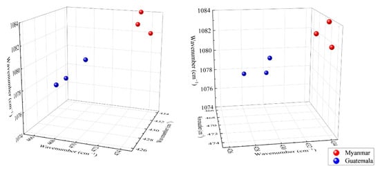 This shift is distinct in the wavenumber region (at the absorption peaks of 1084 cm−1, 588 cm−1, 530 cm−1, 474 cm−1, and 434 cm−1), especially at the 1084 cm−1, 474 cm−1, and 434 cm−1 peaks. For the blue-series samples, the peak positions are 1082–1084 cm−1, 473–474 cm−1, and 433–434 cm−1 for the Myanmar samples, and 1078–1080 cm−1, 467–469 cm−1, and 428–430 cm−1 for the Guatemala samples. In view of these absorption peak differences, the three most variable spectral peaks of the blue-series samples (Figure 7) show that the absorption peaks of the Myanmar and Guatemala samples are located in different regions. This implies that the absorption peak shift can be used to identify the origin of blue-water jadeite jades.