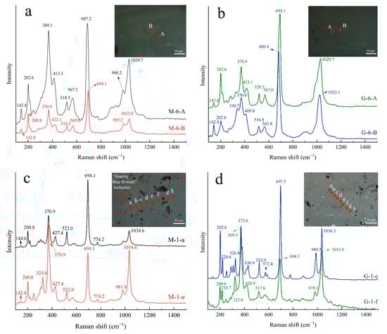 Raman spectra of the samples from Myanmar (M-6, M-1) and Guatemala (G-6, G-1): (a) dark gray (M-6-A) and light gray (M-6-B) mineral grains in sample M-6; (b) dark gray (G-6-A) and light gray (G-6-B) mineral grains in sample G-6; (c) All analysis spots of M-1 have the same peak shift at ~680 cm−1 (e.g., M-1-a and M-1-e); (d) Two analysis spots of G-1 with the maximum (G-1-c) and minimum (G-1-f) peak shifts at ~680 cm−1 in G-1.